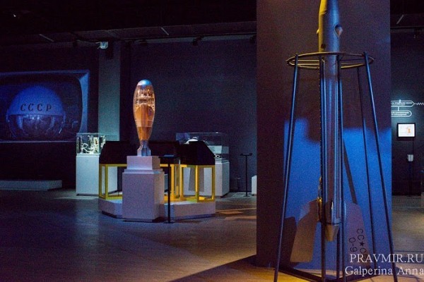 В этом же зале – ракетоплан Циолковского, ставший прообразом будущих «Союзов», макет космического корабля «Восток», в котором вышел на орбиту Юрий Гагарин, костюмы космонавтов.