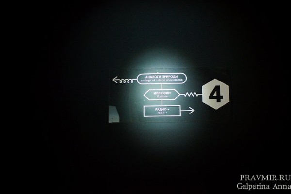 Ее разделили на семь тематических блоков – «Радио», «Плазма», «Энергия ядра», «Иллюзии», «Аналоги природы», «Новый антропогенез», «За пределами земли». По замыслу организаторов, выставка должна вобрать в себя все самое лучшее, что было, есть и будет в отечественной науке.