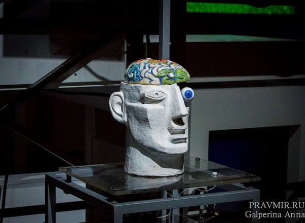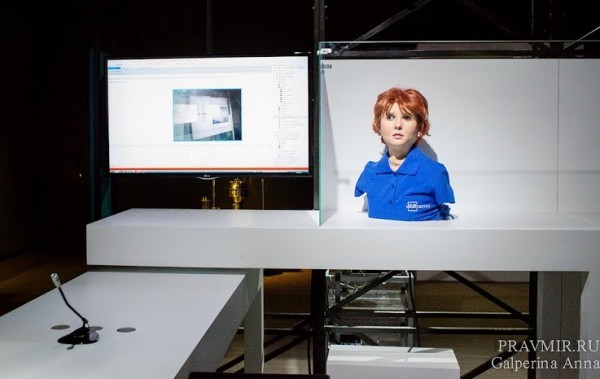 Человеческая голова поворачивается вслед проходящим и моргает. Рядом с головой – микрофон. В него можно сказать: «Здравствуйте». И тогда голова ответит: «Здравствуйте! Меня зовут Алиса».