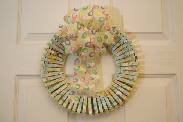 Необязательно покупать специальные материалы. Использовать то, что есть дома под рукой – тоже отличная идея! Рождественский венок на этом фото сделан из прищепок: