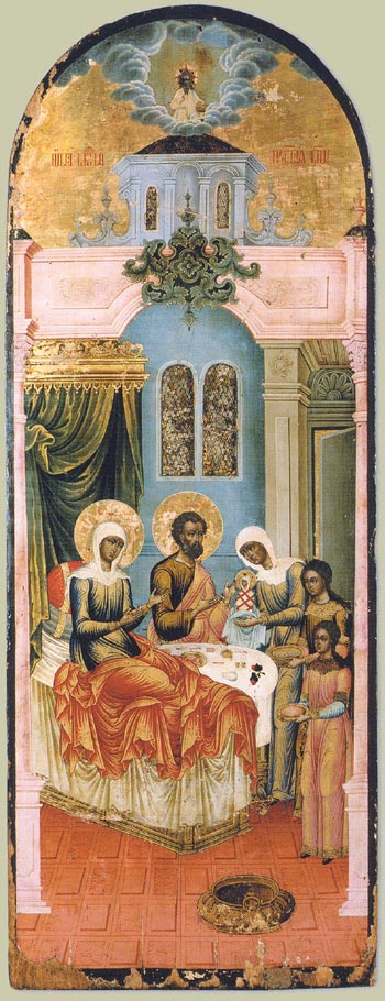 Икона праздника Рождества Пресвятой Богородицы (95×75 см) письма архимандрита Зенона (Теодора), 1998 г., переданная автором в дар общине храма при Санкт-петербургской консерватории