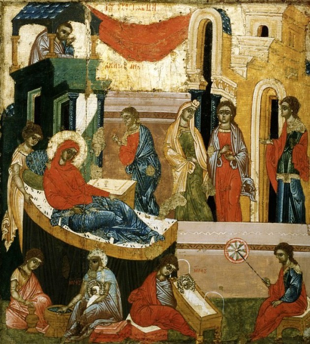 Говоря об изображениях Рождества Пресвятой Богородицы, нельзя не упомянуть и о таком дивном памятнике древнерусской монументальной живописи, как роспись собора Рождества Богородицы Ферапонтова монастыря, исполненная Дионисием в 1502 г. Монументальная фреска над порталом главного входа трогательно изображает обстоятельства Рождества Богоматери: святую Анну на ложе, купель, приходящих поклониться Рожденной жен и дев с сосудами в руках. Бесчадствовавшие Иоаким и Анна изображены справа от портала ласкающими Младеницу.