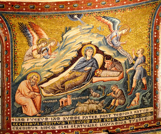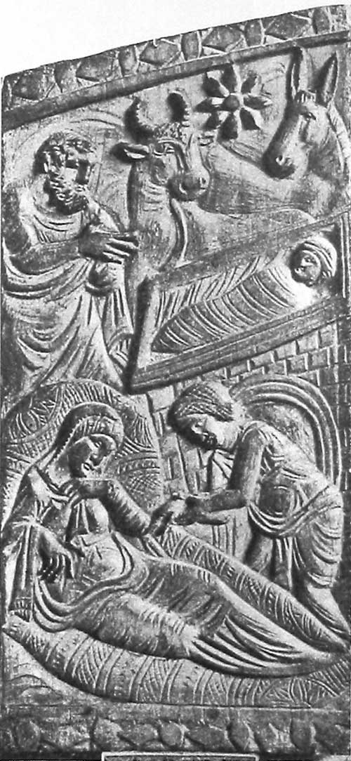Первый станковый живописный памятник с изображением Рождества Христова — сцена, написанная на крышке реликвария из капеллы Санкта Санкторум. Стилистические особенности живописи позволяют предположить, что реликварий происходит из восточных провинции империи, из Сирии или Палестины. Художник изобразил вертеп как пещеру, поскольку хорошо представлял, как выглядит в Иудее укрытие для домашнего скота. Западные художники изображали то, что видели в своих землях — навес, крытый соломой или черепицей.