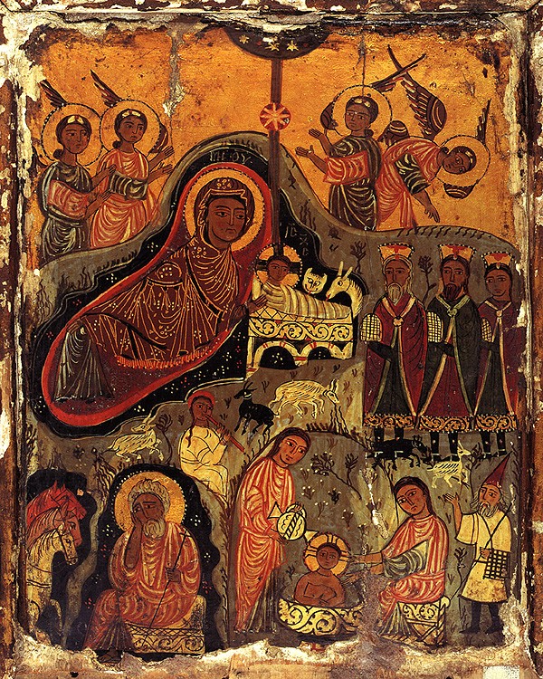 Источниками иконографии являлось как Священное Писание (Мф.:1-2; Лк.:2), так и устное Предание, зафиксированное в таких апокрифах как Протоевангелие Иакова (гл. 17-23) и Евангелие псевдо-Матфея гл. 13-14).