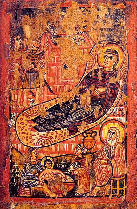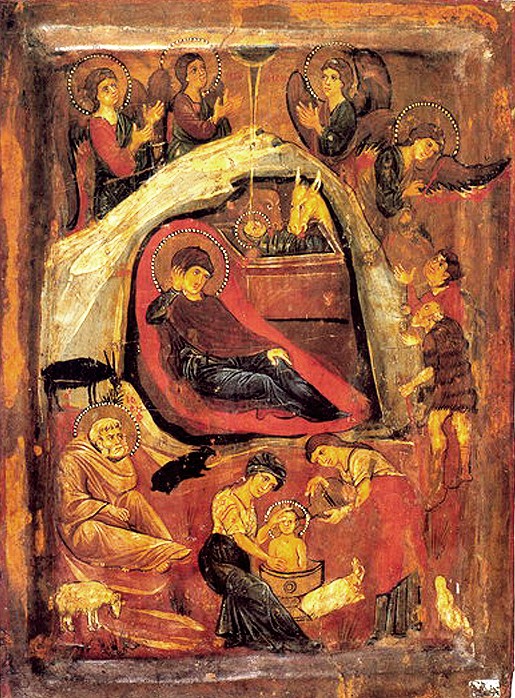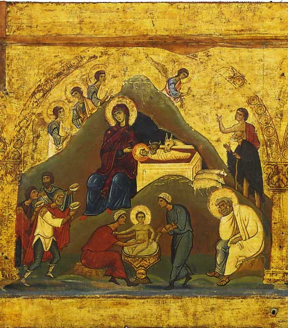 Уже в раннехристианских памятниках появляется изображение «бабы» — одной из повитух, которые пришли к вертепу уже после рождения Христа. В произведениях средневизантийского периода изображаются обе повитухи, омывающие Младенца. Эта несколько «бытовая» сцена — омовение — не описана ни в Евангелии, ни в апокрифах. Ее включение в композицию еще раз подчеркивало подлинность человеческой природы Спасителя и реальность Рождества — после родов любого ребенка нужно омыть.