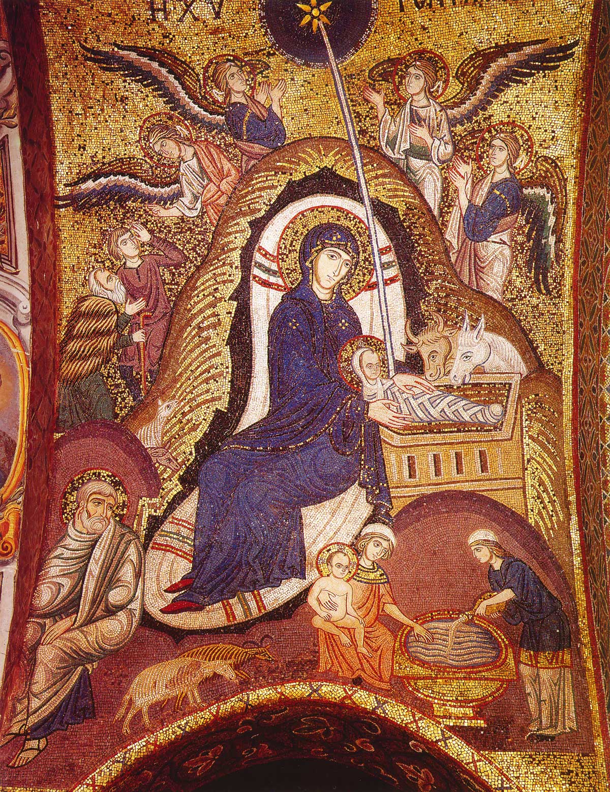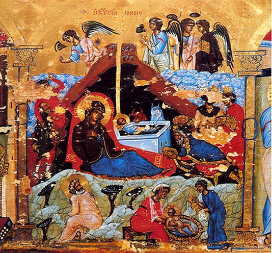 В византийском искусстве небольшая горка с пещерой постепенно превращается в массивную гору, на фоне которой можно поместить все эпизоды: сам вертеп с Богородицей и Младенцем в яслях, над которыми склонились вол и осел, благовестие ангела пастухам, славящих Бога ангелов, поклонение волхвов (или же волхвов, скачущих верхом), омовение Чада повитухами, задумавшегося Иосифа. На некоторых иконах изображаются второстепенные сцены: волхвы перед Иродом, откровение Иосифу, бегство в Египет, избиение младенцев.
