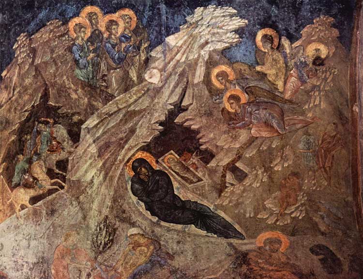 С другой стороны, изображением огромной горы все сцены объединяются в едином пространстве, и даже некотором едином времени. Хронологическая разновременность представленных сюжетов нивелируется. Все происходит как бы в настоящем, сегодня, «здесь и сейчас», как об этом и повествует кондак праздника: «Дева днесь Пресущественнаго раждает, и земля вертеп Неприступному приносит: ангели с пастырьми славословят, волсви же со звездою путешествуют: нас бо ради родися Oтроча младо, Превечный Бог».
