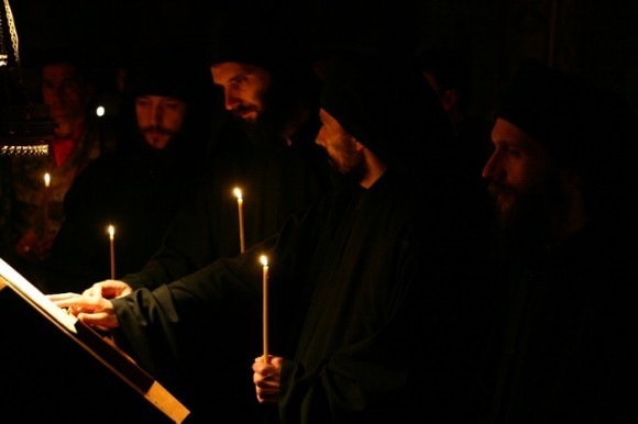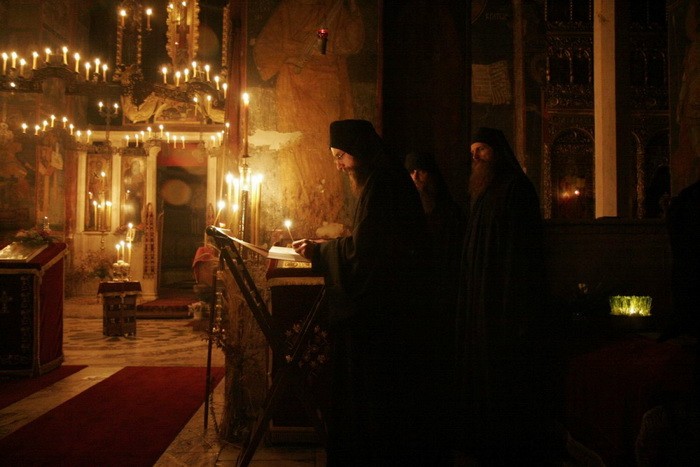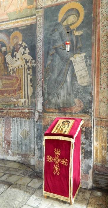 Из кельи мы вышли под звук била. Создавалось впечатление, будто этот звук отсчитывал наши шаги, пока мы двигались к храму. И вот наши руки касаются старинных дверей, через которые прошло не одно поколение людей. Как только заходишь внутрь, тебя охватывает дыхание вечности: представьте, ведь здесь столько веков практически никогда не прерывалась молитва, такое чувство, что здесь все пахнет молитвой, она во всем: во фресках, в мраморных плитах полов, в старинном могучем хоросе.