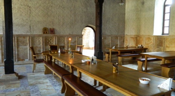 В монастыре прекрасная трапезная. Когда в нее попадаешь, то создается ощущение, что оказался в каком-то средневековом замке. Все очень сдержанно и строго. В центре — длинный стол для братии, а по бокам — несколько столов для гостей обители.