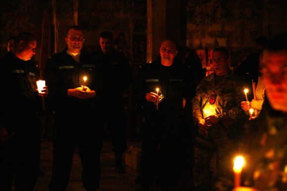 Интересно было наблюдать, как храм постепенно наполняется людьми в военной форме. Это миротворцы. Они считают своим долгом быть на каноне святому Стефану, хотя большинство из них католики. Дечанский монастырь, в основном, охраняют итальянские миротворцы. Им приходится очень тесно общаться с братией и решать многие вопросы вместе. Поэтому знание итальянского языка для дечанских насельников становится нормой.
