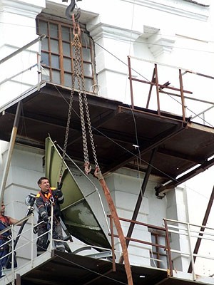 Телеоборудование опустили на землю при помощи мощного автокрана, затем с колокольни сняли расположенные на куполе антенны временные маковку и крест.