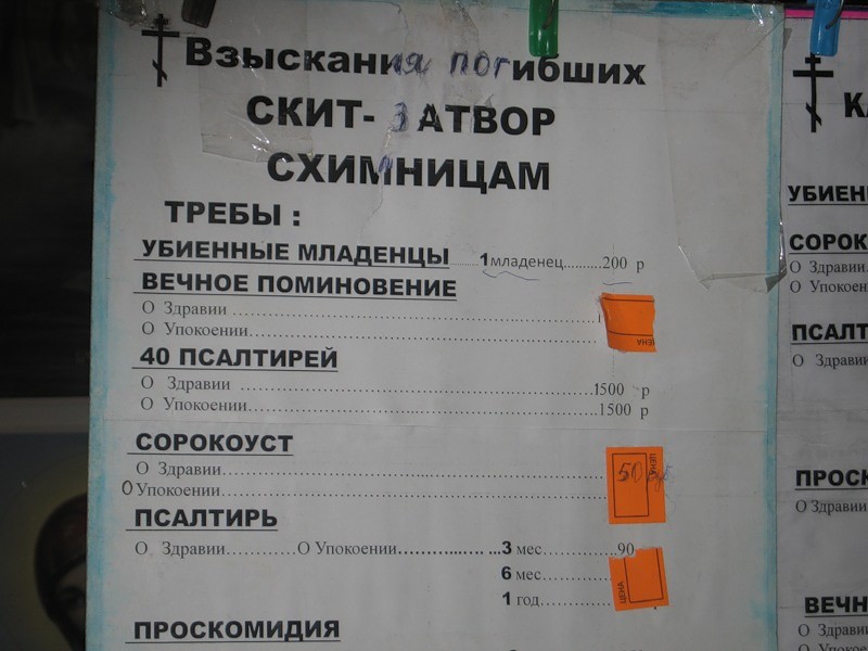 Давайте подсчитаем, сколько можно заработать на такой простой операции из серии «Четыреста сравнительно честных способов отъема денег». В обычной тетрадке в линейку примерно 20 строк. Есть тетрадки в 48 страниц, есть в 96. Соответственно, можно записать от 960 до 1920 имен. Даже если брать по 10 рублей за имя (берут и 15, и 20), то чистый доход от одной тетради составит от 9600 до 19200 рублей (или до 40 тысяч). А ведь некоторые (я бы даже сказал многие) заказывают сорокоусты, просят молитв на полугодие или год, заказывают так называемое «вечное поминание». Тогда одно имя может принести многие тысячи, а тетрадка становится просто драгоценной. То же относится и к запискам на небольших листочках.