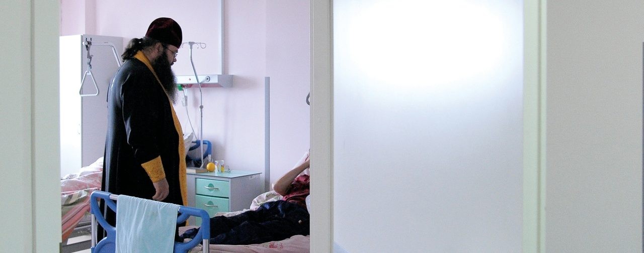 Сегодня пятница, а значит, протоиерею Сергию Васильеву предстоит обойти четыре отделения и в каждом из них отслужить молебен. Всякое молебное пение отец Сергий предваряет небольшой проповедью о том, как важно сохранять веру, особенно в минуту сложных жизненных испытаний. Затем наизусть читает отрывок из Евангелия от Матфея — о сотнике, попросившем Христа исцелить своего слугу и проявившем чудеса веры, которые удивили даже Самого Спасителя.