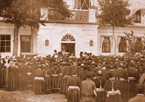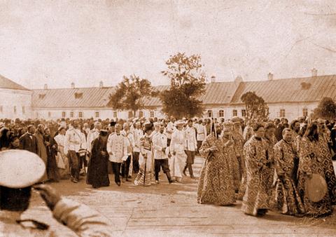 Отбытие Их Императорских Величеств из Сарова. Их Величества, предшествуемые духовенством, идут к св. вратам 20 июля 1903 г.
