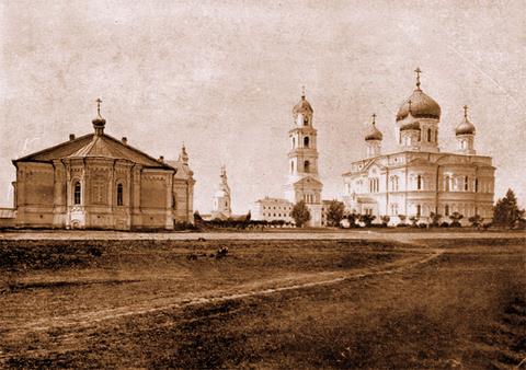 Серафимо-Дивеевский женский монастырь (с левой стороны) — трапезная, приходская церковь, колокольня и собор