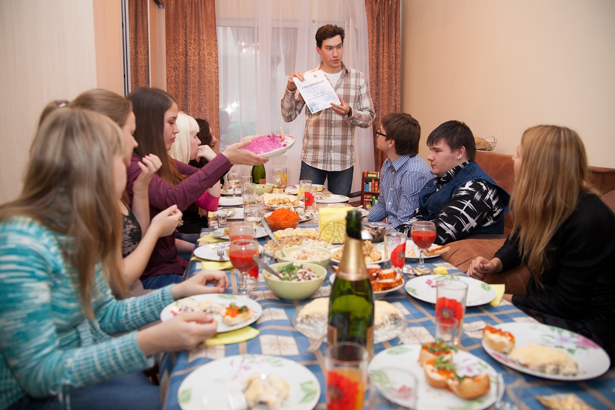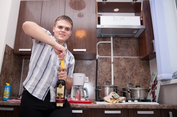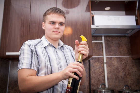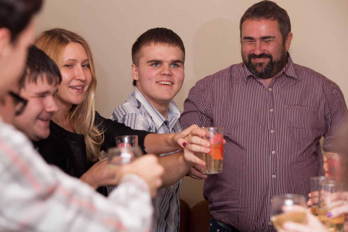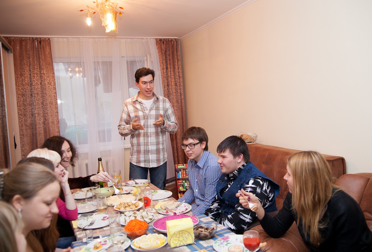 На новоселье первокурсника Володи Васкевича собралось множество людей: друзей и одногруппников, как зрячих, так и незрячих. Сам Володя вполне уверенно передвигается по своей новой квартире, лишь изредка для подстраховки касаясь стен. И неудивительно: в этом жилье он знает каждый миллиметр. Владимир сам планировал интерьер квартиры, примерно определял, каким будет кухонный гарнитур, и даже в ремонте участвовал сам: подклеивал обои, если на ощупь определял, что они отходят от стен, подбивал рассохшиеся дверцы шкафов.