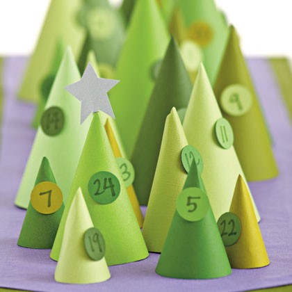 А сколько еще простых вещей можно использовать для создания оригинального календаря: одноразовые стаканчики, баночки, конверты. Я встречала идею календаря на подносе — если совсем некуда что-то подвешивать — бумажные конусы, раскрашенные под елочки, а под ними сюрприз!