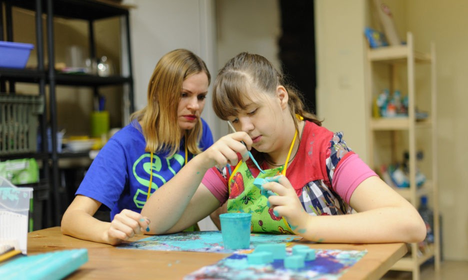 — Юле неважно, что делать, главное — делать это с ребятами, — рассказывает Валерий, ведущий «Мастерской». — У нее проблемы с речью, но это не проблема — она берет кого-то за руку, того же Владика, и включается.