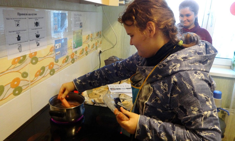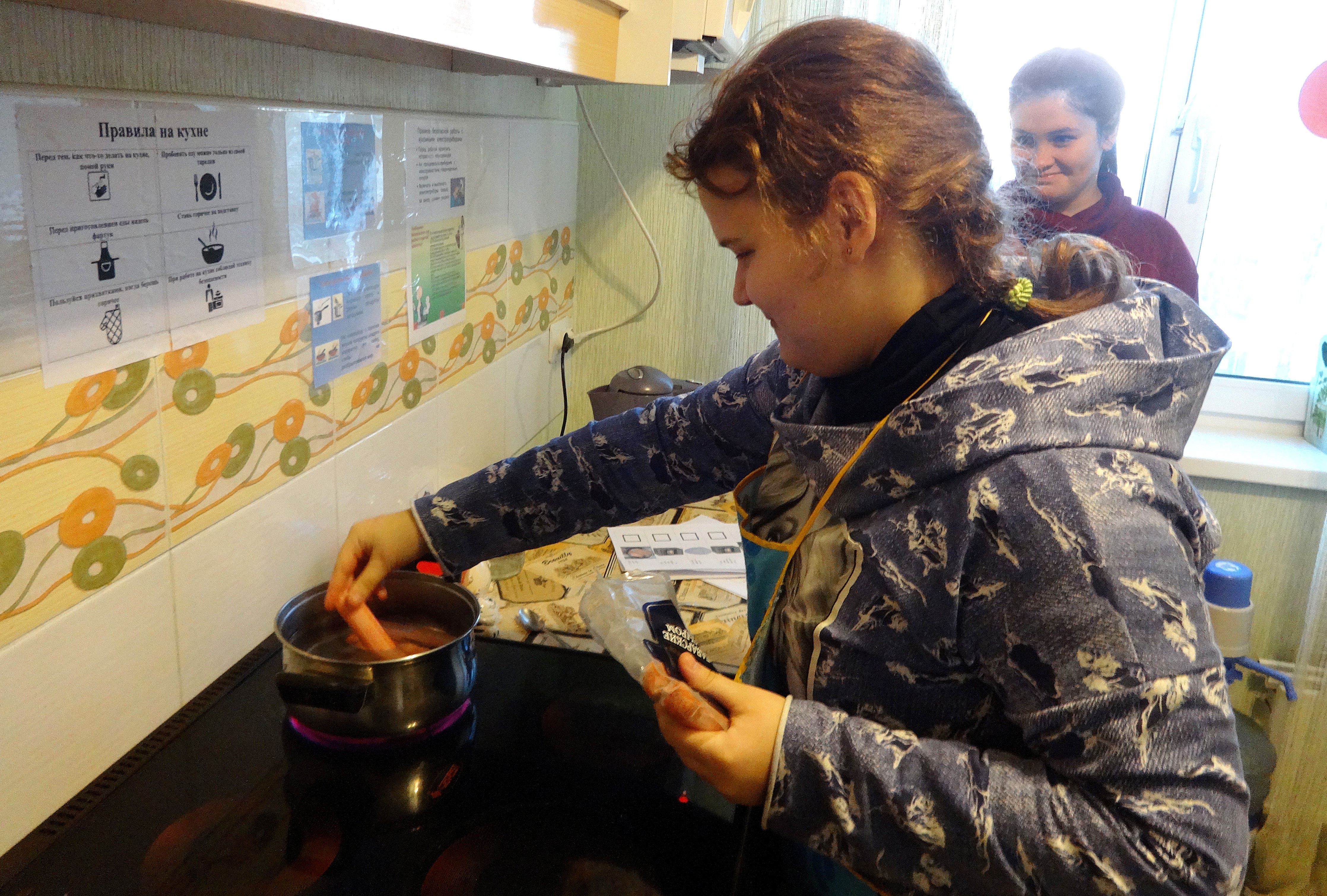 На кухне тренировочной квартиры дым коромыслом – сегодня здесь учатся готовить омлет и варить сосиски. В воздухе уже витают узнаваемые запахи.
