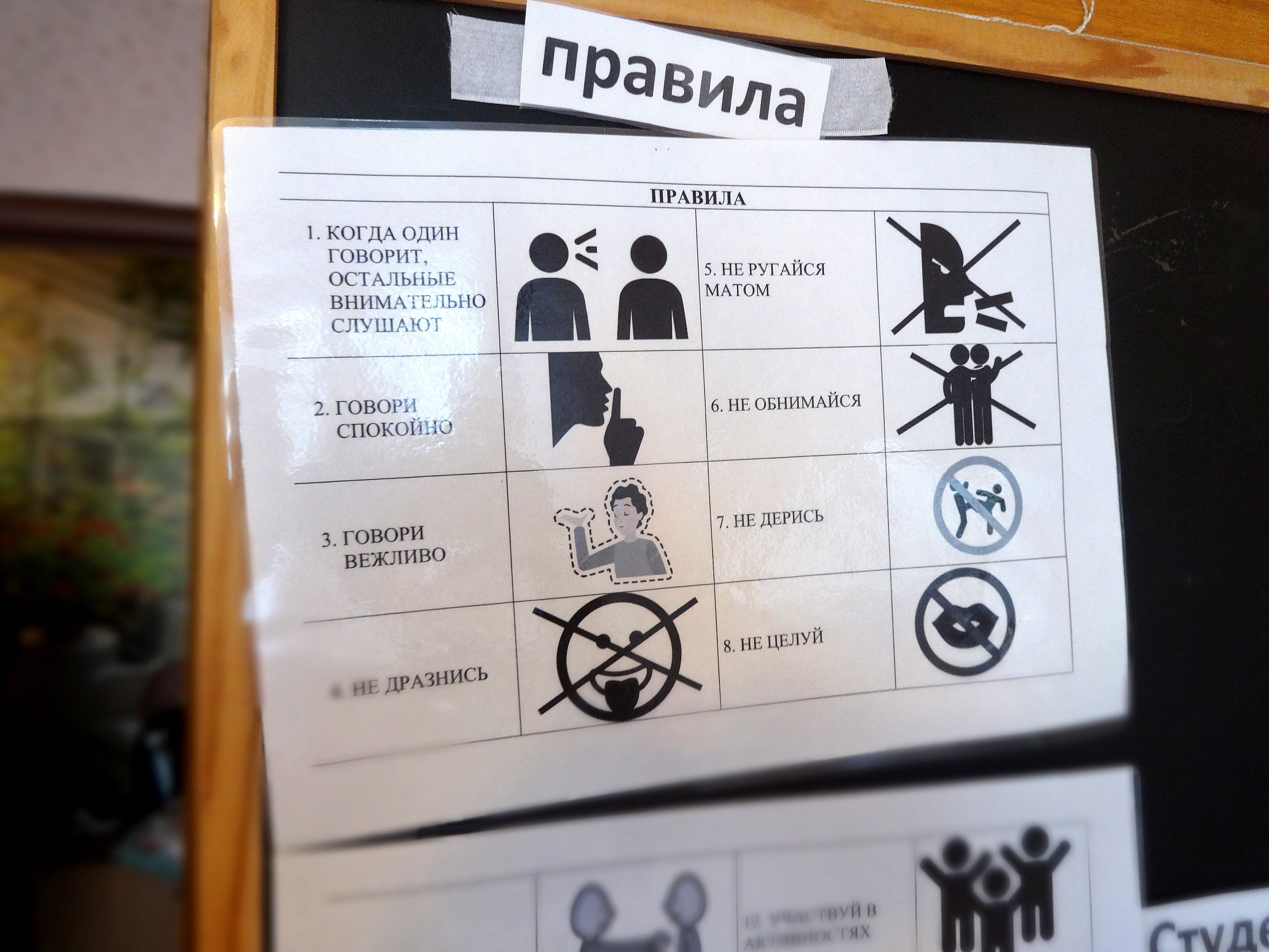 С виду это обычная квартира на 9-м этаже в серой многоэтажке в центре Тюмени на улице Комсомольской. Стандартная кухня с необходимой техникой и утварью, просторный зал с мягким диваном, учебная комната со столами, стульями и яркими пособиями. Единственное отличие – карточки с надписями. Они везде – над розетками и выключателями, на дверях туалета и ванной, на стенах кухни. «Снять верхнюю одежду», «Помыть руки», «Выдернуть шнур из розетки» и так далее. Потому что это не простая квартира, а учебно-тренировочная площадка для людей с расстройствами аутистического спектра.