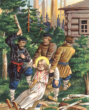 Сорок семь лет прожил он в различных подвигах отшельничества, молчальничества, затвора. Но на этом пути встретилось ему второе Иовлево искушение: когда он уже был лишен всего, перед ним встал вопрос о сохранении своей жизни, об избежании страдания. На него напали разбойники, он был вооружен топором, он мог защититься – но он не захотел спасти свою жизнь никакой ценой, а отдал ее еще раз Богу. И эту жертву Бог принял: Серафим был избит, изранен, и кровь его осталась на его одежде, кусочек которой мы можем здесь созерцать. Он остался верен Богу до крови; жизнь его – сохранил Господь…