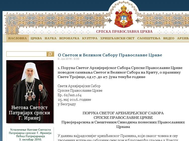 «Мы вынуждены с сожалением, но в то же время с чувством своей пастырской и церковной ответственности, оповестить Ваше дорогое и уважаемое святейшество и Ваш Святой и Священный синод, что наша Церковь чувствует затруднение участвовать в созванном Святом и Великом Соборе и предлагает отложить его на некоторое время, чтобы наше скорое собрание на Крите рассматривалось как предсоборное межправославное совещание с целью дополнительной подготовки Собора и проработки с целью улучшения его текстов или, в большей степени, начальной фазой всего соборного процесса, который необходимо завершить в дельнейшем, в следующей фазе, после того, как будут устранены разногласия и будут достигнуты единомыслие и консенсус Церквей», — цитирует агентство заявление, опубликованное на сайте Сербской Церкви.