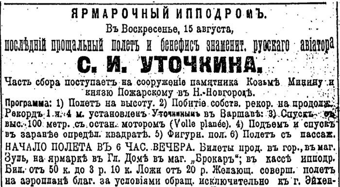 У Уточкина, несомненно, имелось и литературное дарование – это видно даже по воспоминаниям о полете. Настоящий сын серебряного века! Вскоре после первого полета он начал мечтать о самолете собственной конструкции. И – бросил всю свою энергию на пропаганду авиации. Стал авиатором-спортсменом.