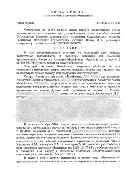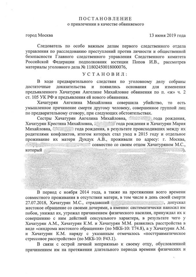 — Моей подзащитной в пятницу было предъявлено то же самое обвинение по п. «Ж» ч. 2 ст. 105 УК РФ – «Убийство группой лиц по предварительному сговору». Отличалось постановление от прежнего только более подробным описанием мотива — злодеяний отца по отношению к дочерям, ссылкой на заключение психолого-сексолого-психиатрических экспертиз в отношении Михаила Хачатуряна и сестер. Уверен, что данное постановление еще подвергнется критике и со стороны руководства Следственного комитета, и со стороны прокуратуры, до того, как дело направят в суд. Насилие со стороны отца повлекло тяжелые последствия для психики Марии. У нее была диагностирована “острая реакция на стресс”, из-за чего Мария действовала в состоянии невменяемости, которое не исключает необходимой обороны. Я убежден, что действия Марии должны быть расценены как необходимая оборона в соответствии со ст.37 УК РФ».