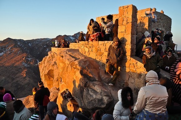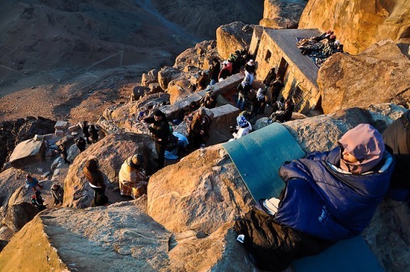 Сейчас на вершине - несколько сот человек. Очень много верующих, люди молятся. Мусульмане тоже почитают и это место, и Мусу - пророка Моисея.