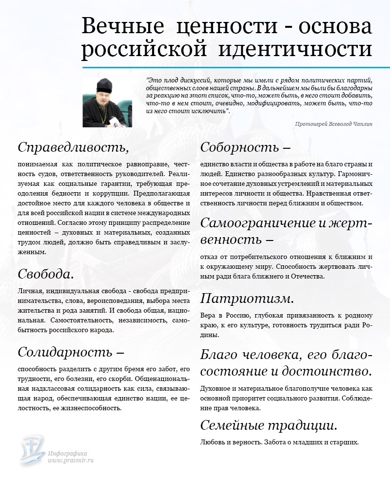 На XIX Рождественский чтениях председателем Синодального отдела по взаимодействию Церкви и общества протоиереем Всеволодом Чаплиным был озвучен проект документа «Вечные ценности — основа российской идентичности».