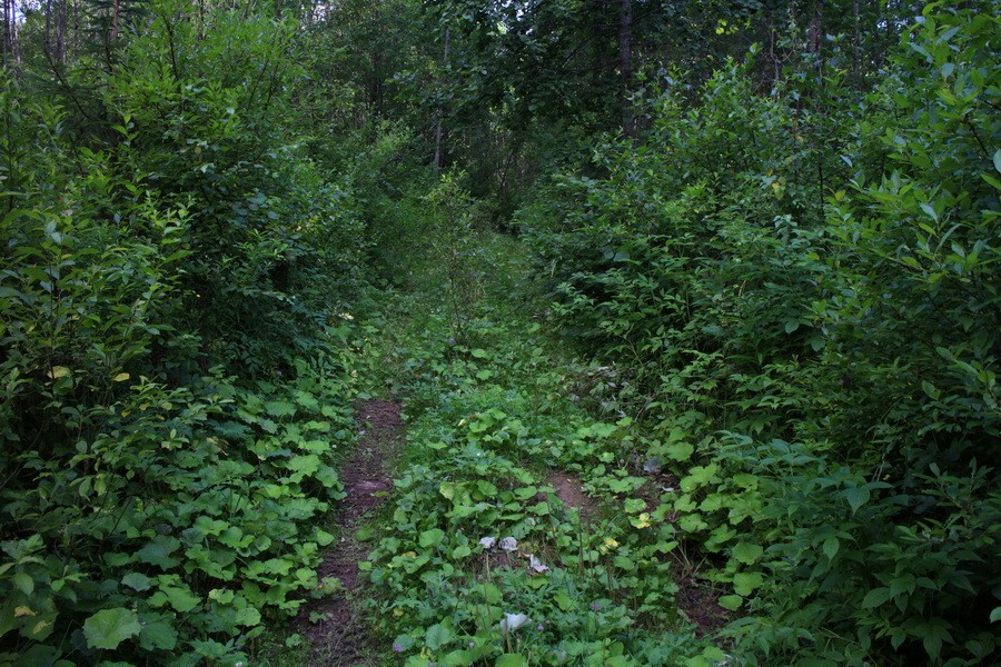 Вот и последний магазин, видимо, на пути – женщины внутри говорили на вепсском. Подсказали мне дорогу. Правда из-за этого я сделал крюк – все дороги заросли, и пришлось возвращаться и отклоняться от маршрута. По пути села становились все меньше и меньше, а дорога — все хуже и хуже. Только многочисленные лесовозы нарушали спокойствие леса. Я объелся земляникой и черникой, нашел на ужин парочку подосиновиков. Вскоре дорога совсем стала незаметной, пошли лужи и грязь.