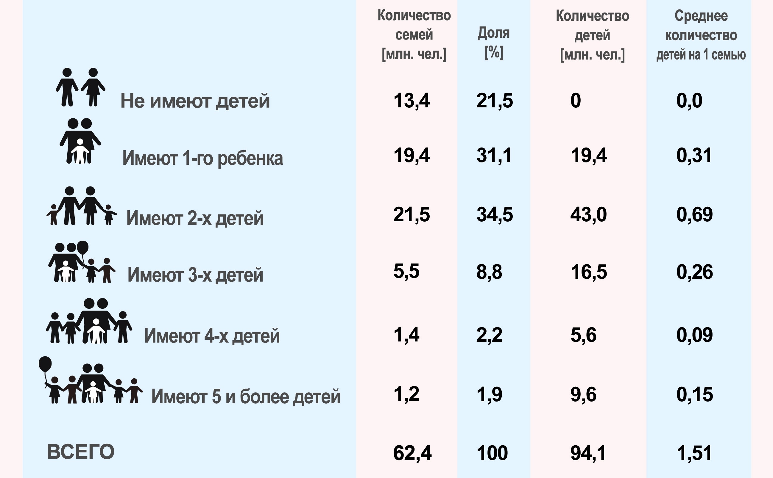 Среднее число детей на семью – очень удобный параметр, позволяющий анализировать демографическую ситуацию в стране, а также строить некоторые прогнозы. Согласно переписи 2010 года в нашей стране было 33 млн. семей, в среднем на каждую семью приходилось 1,5 ребенка. Тогда округленно можно считать, что на 33 млн. семей приходится 50 млн. детей. При этом семей с 4-мя и более детьми всего лишь чуть более 4%.
