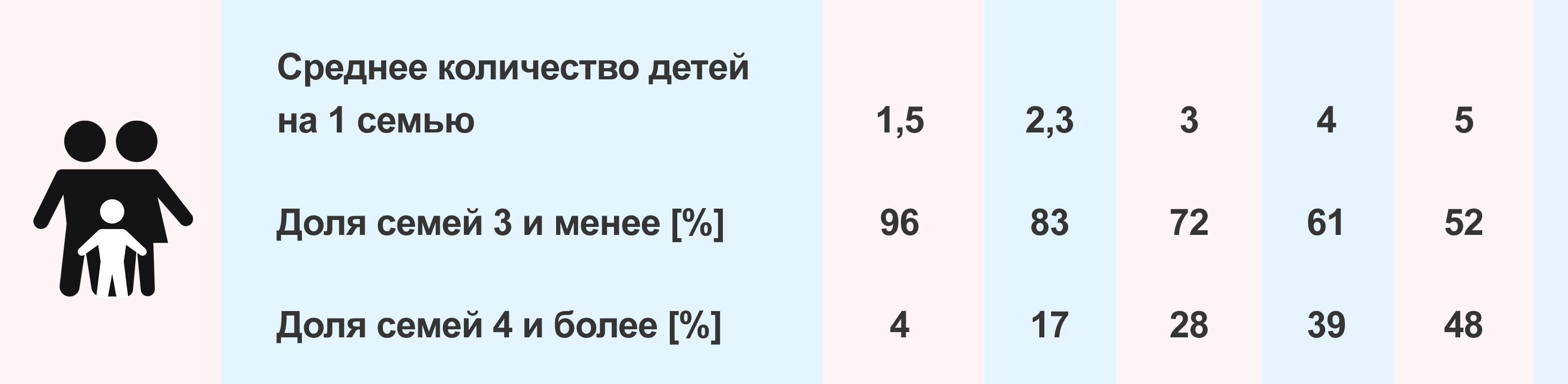 Таблица 2. Доля семей (3 и менее) и многодетных (4 и более) семей в зависимости от среднего количества детей на семью (расчет)