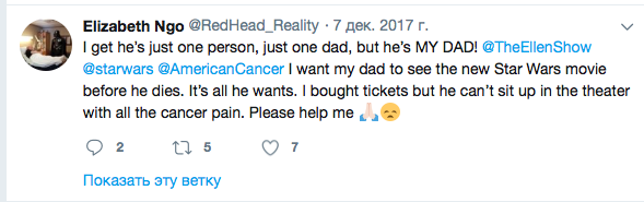 «Я хочу, чтобы мой отец увидел новые «Звездные войны» до того, как он умрет. Это все, что он хочет. Я купила билеты, но из-за раковой боли он не может сидеть в кинотеатре. Пожалуйста, помогите мне!»