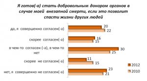 Динамика данных с 2010 по 2012 год показывает, что число согласных стать добровольными донорами внутренних органов практически не изменилось (их по-прежнему около 40%), как не изменилась и приверженность большинства опрошенных мнению, что отсчёт человеческой жизни следует вести с момента зачатия, а не с момента рождения (с этим в 2010 году согласились 70% респондентов, в 2012 году — 68%).