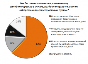 Лишь 1 из 10 относится к искусственному оплодотворению негативно, считая приёмных детей хорошим альтернативным решением для бездетных пар. Более четверти россиян не уверены в своём отношении к искусственному оплодотворению: 14% затруднились ответить на вопрос, ещё 14% высказались неоднозначно.