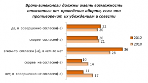 В то же время общество стало менее категоричным по отношению к свободе выбора врача в случае необходимости проведения аборта: количество тех, кто считает, что врачи не должны иметь возможности отказа от проведения аборта уменьшилось на 10%, а вот не определившихся в своём мнении стало на 8% больше. При этом мнение о необходимости информирования женщин о возможных последствиях аборта несколько ослабло: в 2012 году на 3% увеличилась доля отрицающих необходимость информирования и на 5% снизилась доля убеждённых в необходимости информирования.