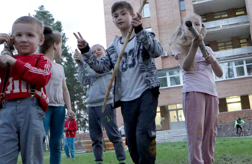 Около столовой играет музыка — приехали аниматоры. Дети бегут на звуки музыки из длинных двухэтажных корпусов. Малыши играют в салки, прячутся под разноцветным тканевым куполом, прыгают через веревочку. Дети хохочут. Рядом в беседке сидят мамы.