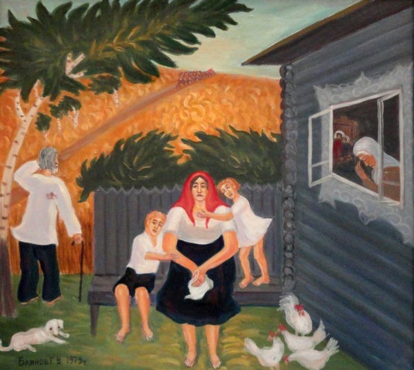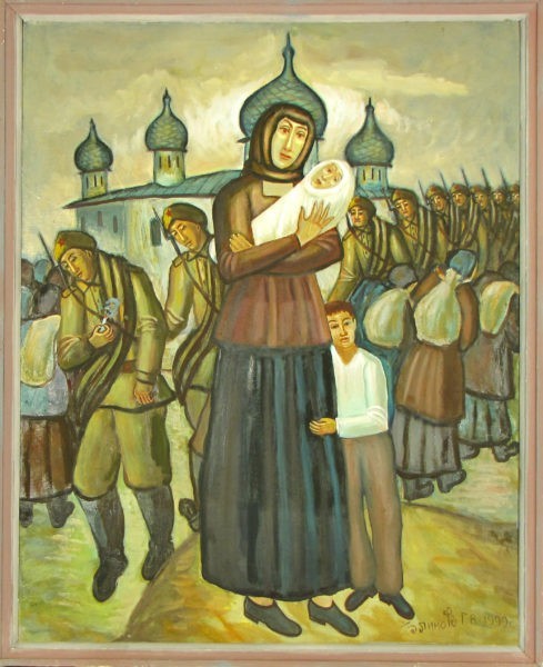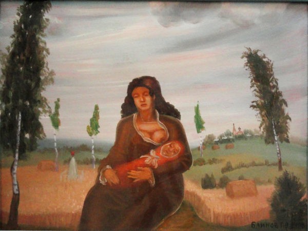 Картина «22 июня 1941 года» – пожилой человек провожает односельчан в армию. Пока еще 22 июня, войну только объявили, но все уже понимают, что, скорее всего, не все солдаты вернутся домой. Картина трагическая, как и другие две работы Блинова. На всех трех картинах образ матери с ребенком является центральным.