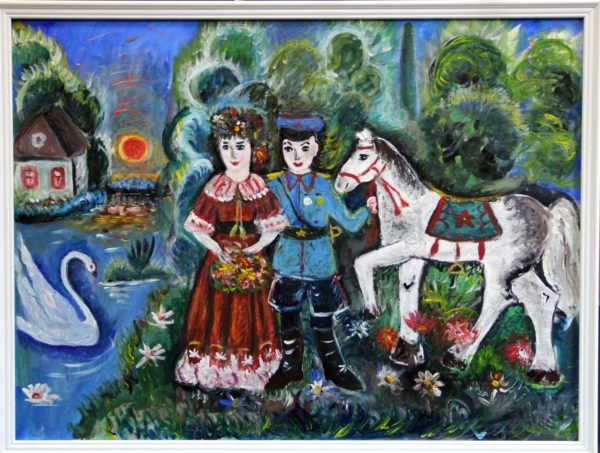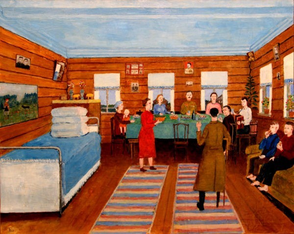Картина «Возвращение героя» Елены Григорьевой – кандидата физико-математических наук, сотрудницы Института физики Земли им. О.Ю. Шмидта РАН, а впоследствии журналиста, – выделяется из подборки яркими красками и особой радостью – где-то даже нарочитой и лубочной.