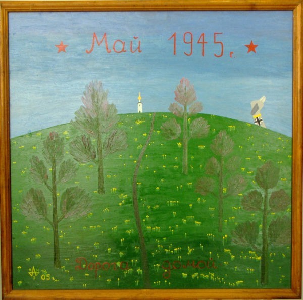 У Владимира Григорьевича Аносова очень лаконичный стиль живописи. Тропинка к храму, сбитый самолет, редкие деревья… «Дорога домой» – сильная картина: на ней изображен как будто нездешний мир. И в то же время эта картина – символ возвращения, дома, Победы.