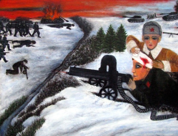 На ее картине мы видим, как солдат строчит из пулемета, а в это время медсестра перевязывает ему голову. Очень напряженная, экспрессивная картина «На рубеже обороны Москвы». Идет баталия, но женщина очень спокойна. Интересно, что это именно автопортрет художницы, хотя на войне она была не медсестрой, а разведчицей.