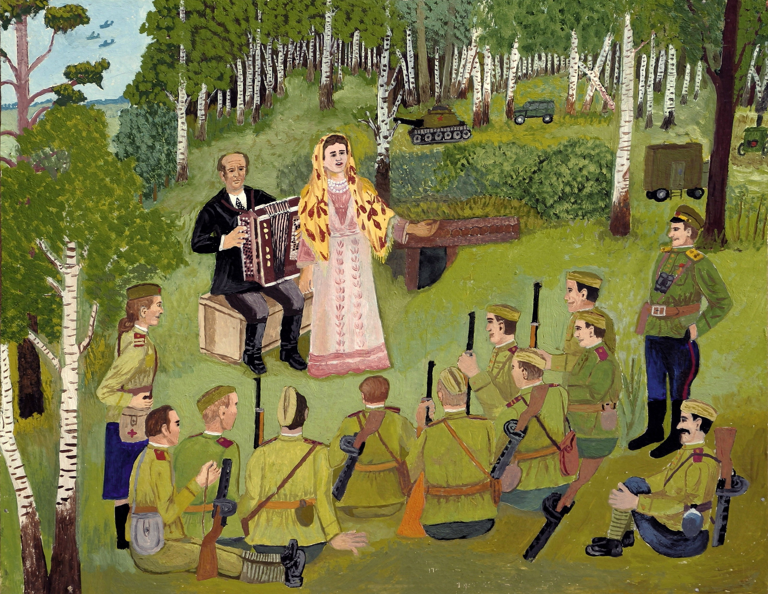 Для каждого художника-наива, который обращался к теме войны, – это всегда настоящая личная история. Они не выполняют какой-то заказ, как профессиональные художники, не осмысливают войну в каком-то политическом или историческом контексте. Сюжеты они выбирают по своему сердцу, поэтому большая часть творчества фронтовиков посвящена мирным сюжетам. У них нет потребности в героике, но если они все-таки пишут картины на тему войны, то показывают либо военный быт, либо трагедию, боль.