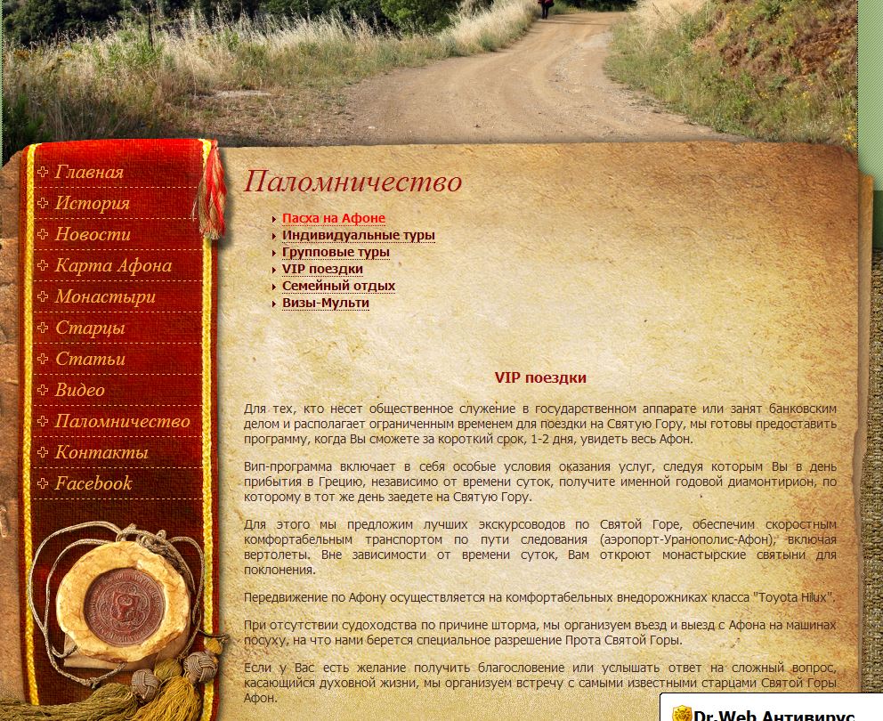 «Для тех, кто несет общественное служение в государственном аппарате или занят банковским делом и располагает ограниченным временем для поездки на Святую Гору, мы готовы предоставить программу, когда Вы сможете за короткий срок, 1–2 дня, увидеть весь Афон….. Вне зависимости от времени суток, Вам откроют монастырские святыни для поклонения….Если у Вас есть желание получить благословение или услышать ответ на сложный вопрос, касающийся духовной жизни, мы организуем встречу с самыми известными старцами Святой Горы Афон».
