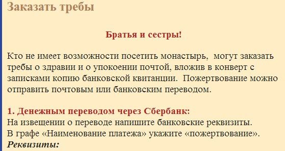 «Кто не имеет возможности посетить монастырь, могут заказать требы о здравии и о упокоении почтой, вложив в конверт с записками копию банковской квитанции. Пожертвование можно отправить почтовым или банковским переводом».