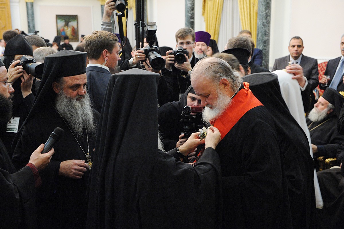 Патриарх Феофил приветствовал Патриарха Кирилла и вручил ему орден Живоносного Гроба Господня «Большой крест Святогробского братства».