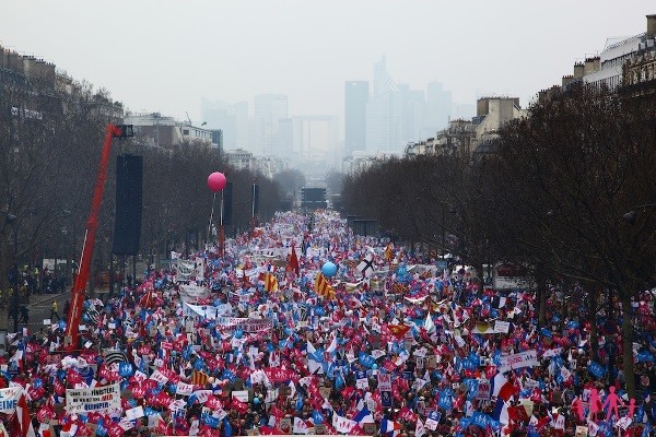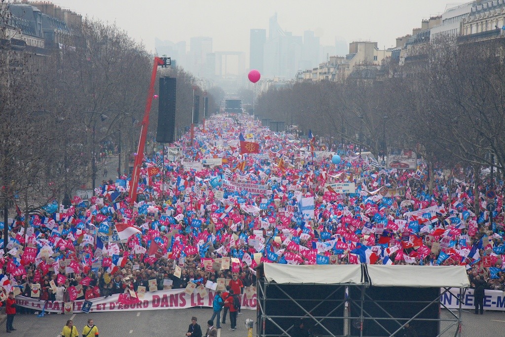 25 марта, ПРАВМИР. В Париже прошла масштабная акция протеста против легализации однополых браков. В ней приняли участие от 300 000 (данные полиции) до 1 400 000 человек — данные организаторов. Участники акции прошли от квартала Дефанс к Триумфальной арке.