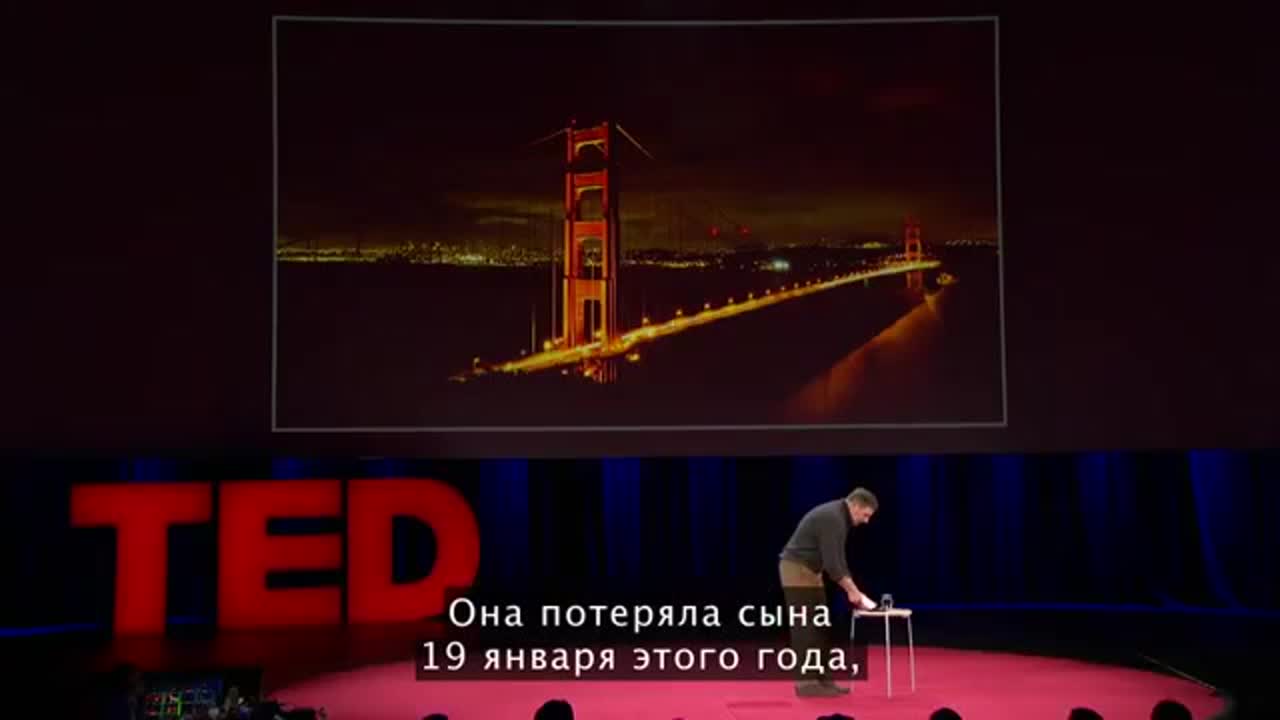 Я хочу уверить вас, что большинство людей, которых мы встречаем на том мосту, не совершают самоубийство. Кроме того, те немногие, кто спрыгнул с моста, выжил и мог говорить о случившемся, лишь один-два процента, большинство этих людей сообщили нам, что в ту секунду, когда они прыгнули вниз, они осознавали, что совершили ошибку, они хотели жить.