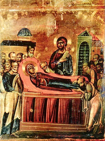 — Жила Пречистая вместе с Иоанном Богословом, проводя все свои дни в рукоделии и молитве. Апостолы приходили в Иерусалим к Ней, как к своей Матери, получая в беседах с Ней силы для нелегкого своего служения. И когда пришло время переселиться Деве Богородице в Небесные обители, пришел к Ней архангел Гавриил, сообщая Ей скорое событие Ея Успения и подарив Ей ветвь финиковой пальмы. Когда же почила Пресвятая, то ветвь эту несли апостолы, провожая Богородицу в последний путь. Иудейский священник Афония, пылая гневом на христиан и, особенно на Всемилостивую Владычицу, захотел опрокинуть гроб. Однако тотчас ангел отсек ему обе руки. Уверовал Афония во Христа. Попросил у Него и Его Пречистой Матери прощения, и руки вновь приросли на место. А когда на третий день открыли пещеру, где погребли Всецарицу, то тела Ее там не оказалось. Воскресла Матушка Божия и взошла с телом к Своему Сыну, чтобы царствовать с Ним. Но вновь и вновь приходит Богородица на землю, чтобы помочь бедным страждущим людям в нелегкой их земной жизни.