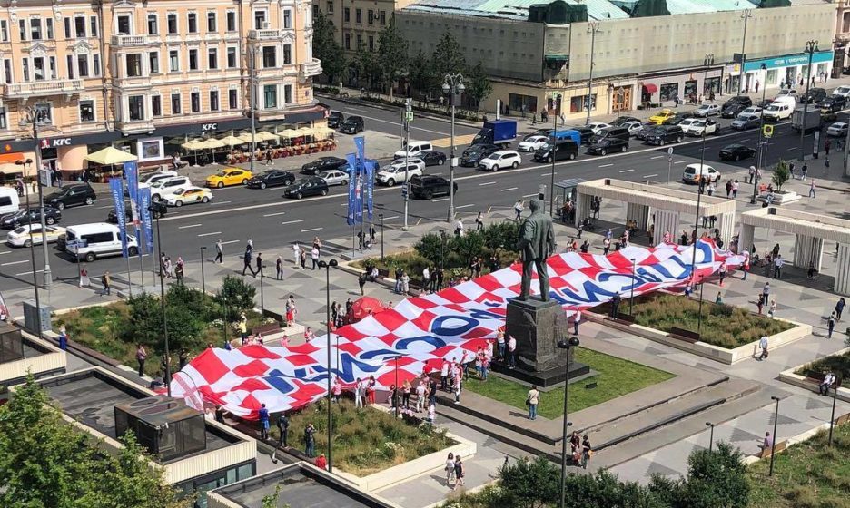 Они развернули на Триумфальной площади Москвы огромный флаг с надписью «Спасибо, Россия!». Слова благодарности были написаны на русском языке на фоне красно-белой клетки, которая изображена на гербе Хорватии. Баннер длиною примерно в половину футбольного поля растянули несколько десятков человек, которые начали скандировать «Россия! Россия!».